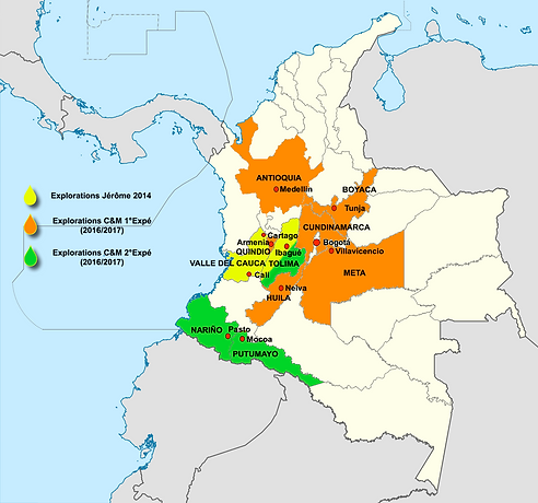 En 2016/2017, lors d'une première expédition, nous avons ouvert des canyons sur les départements du Valle Del Cauca, du Quindio, de l'Antioquia, du Cundinamarca et avons descendu de belles classiques dans les départements du Huila et du Putumayo.